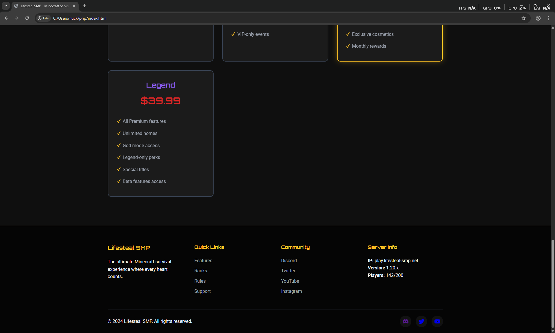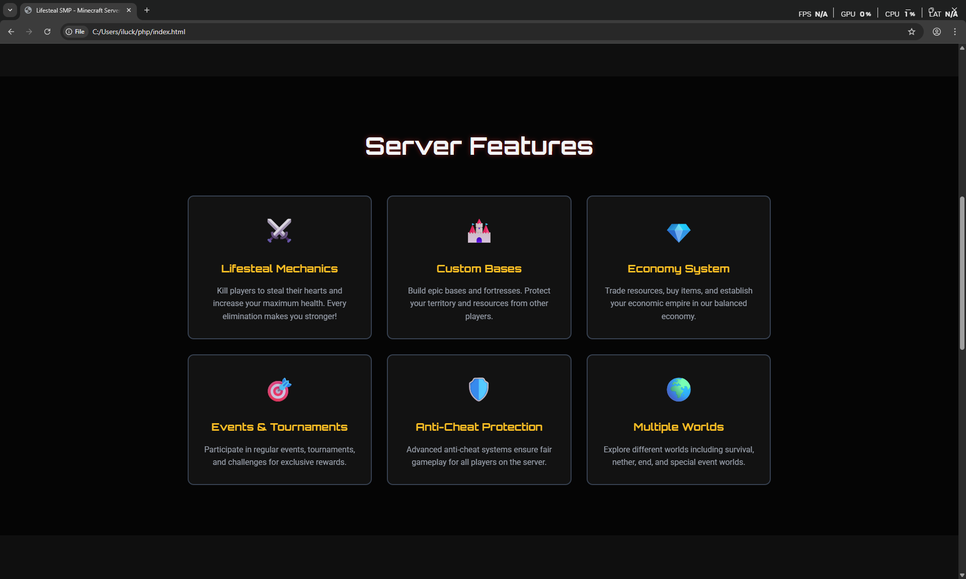 A modern, responsive landing page for a Lifesteal SMP (Survival Multiplayer) Minecraft server featuring animated backgrounds, interactive elements, and a gaming aesthetic.